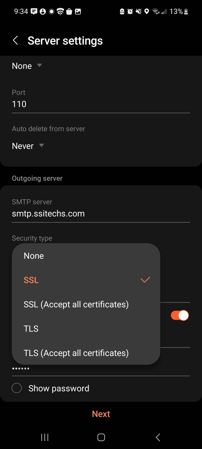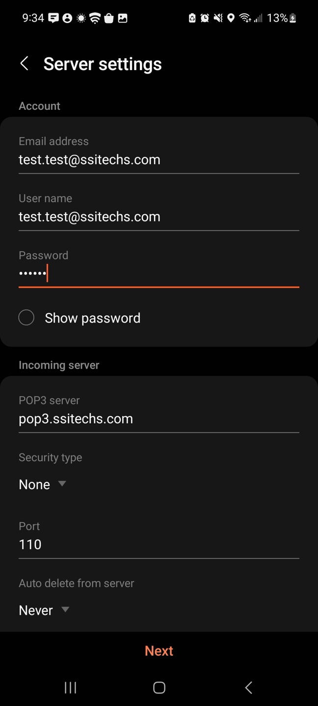 Server Setting should auto fill / Change SSL to None As Pictured Below on Both Incoming POP3 and Outgoing SMTP / Select Next